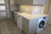 V bytě je nová kuchyňská linka na míru varná deska, trouba, myčka, lednice s mrazákem, pračka, úložné skřínky a stůl.